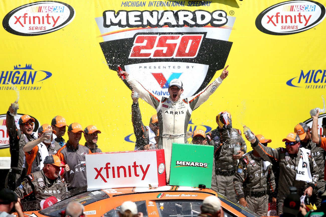 Another Xfinity teammate had a weekend deserving of a shout out. Although everyone knew it was only a matter of time before the "other 19" Arris Toyota found success, it has always seemed just out of reach for Daniel Suarez. He did do his best to put it out of reach on Saturday in Michigan, too. Apparently lead feet run in the 19 family, because Daniel Suarez got nabbed speeding on pit road. The resulting drive-through penalty put him well back in the field. Thankfully he made that error early in the race, giving him plenty of time to drive himself back up to the leaders. With ten laps to go, he found himself in 2nd place behind Kyle Busch. He crept closer and closer to the leader until he was right on his tail with two laps to go. He made a clean pass to take the white flag in the lead and held him off to the finish line.